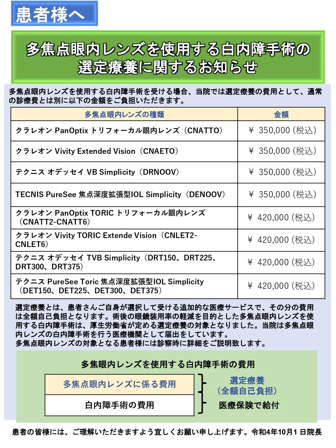 多焦点眼内レンズは、画像に掲載しているもの全て選定療養多焦点眼内レンズになります。